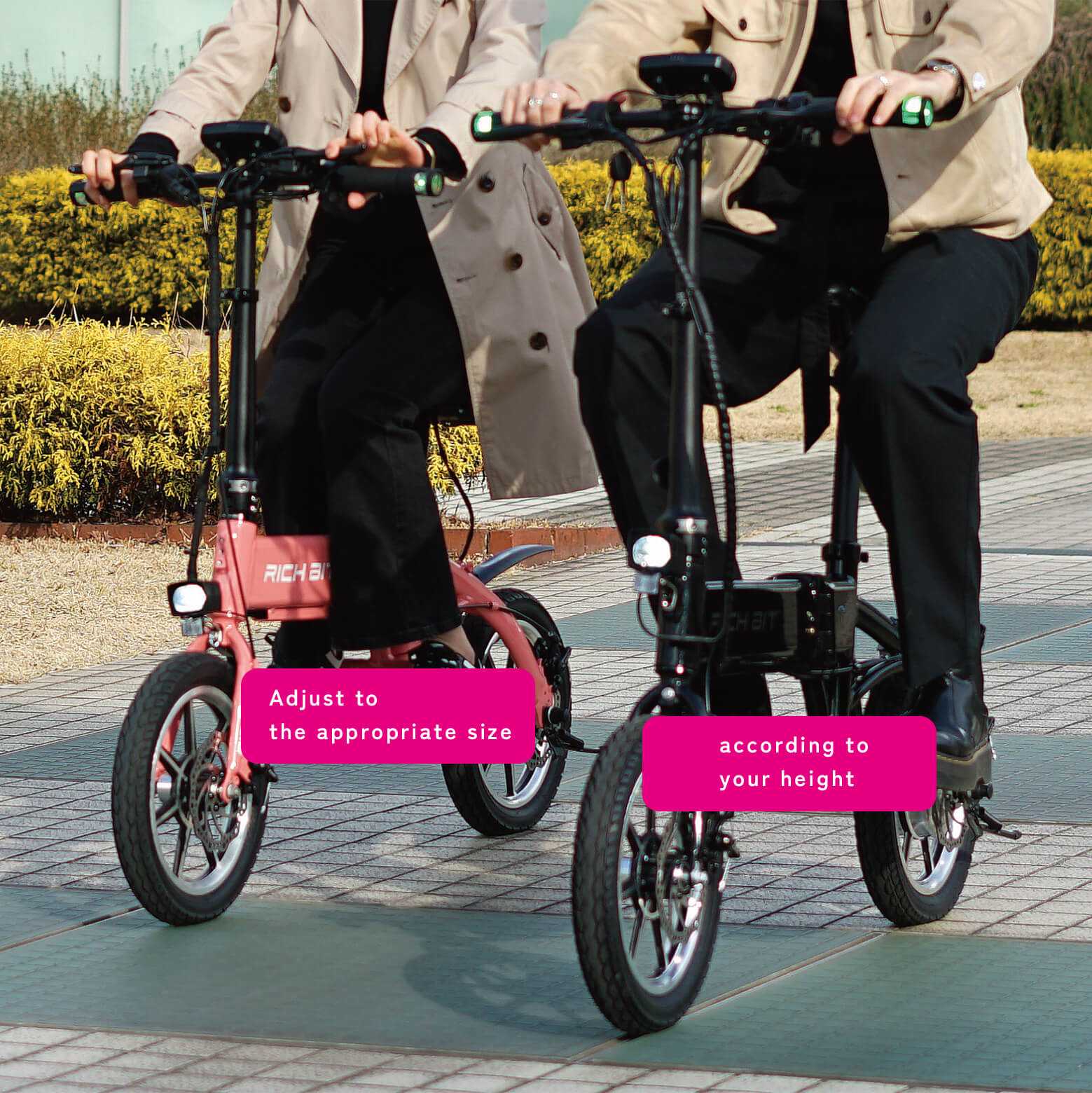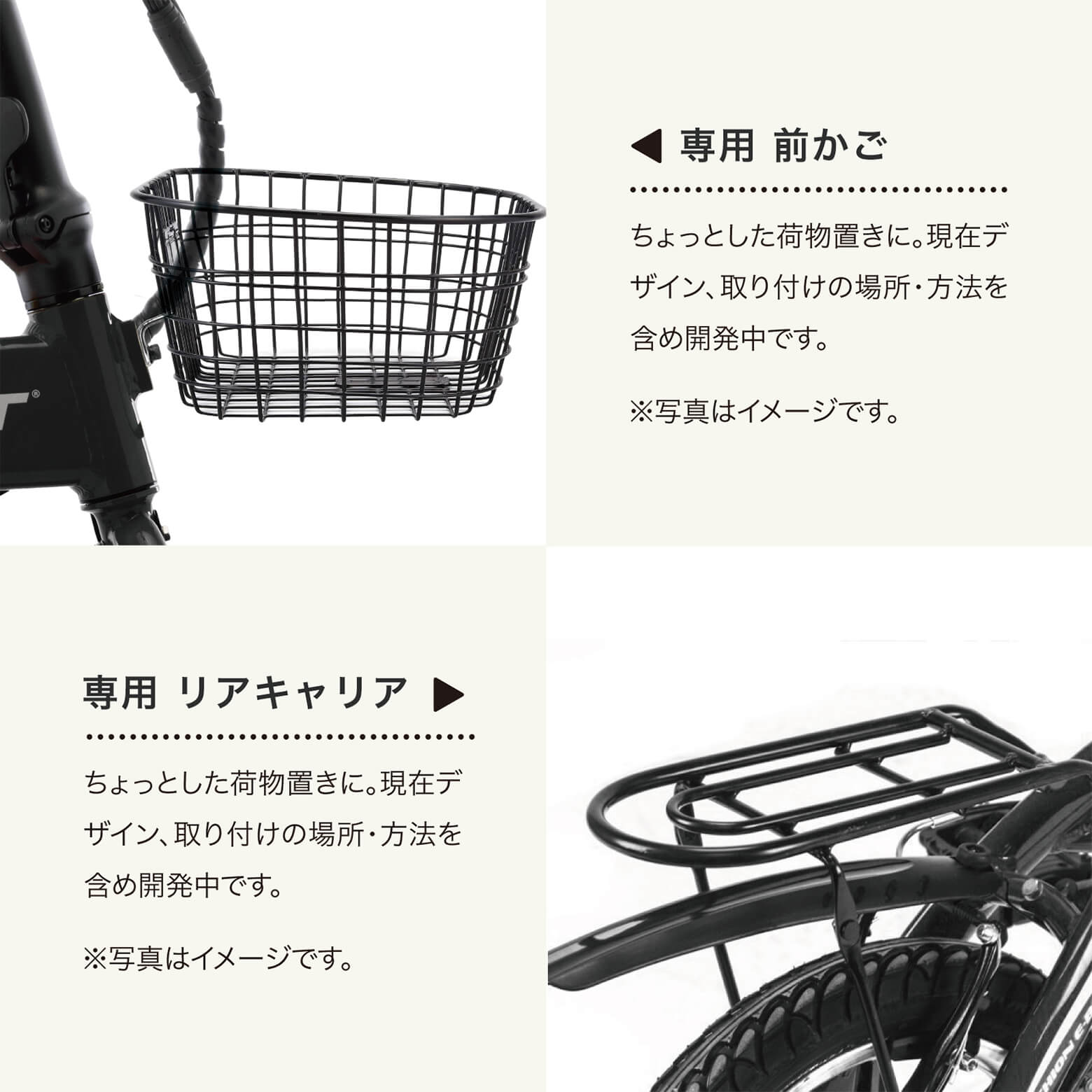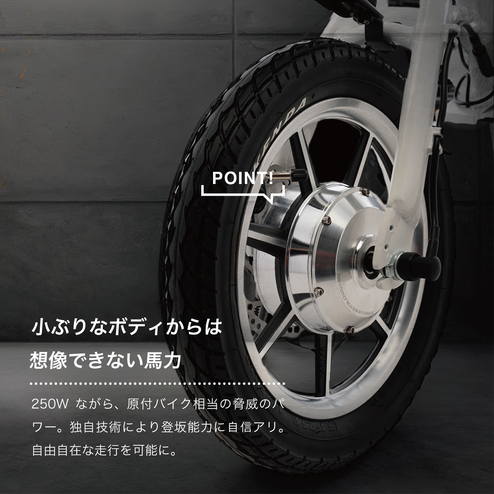 キックボードタイプと異なり、低重心でバランスがとりやすく、自転車のように乗ることが可能です。14インチのタイヤを採用し、段差や荒れた路面でも安定して走行できます。また、モーターは20%の急な坂道も登れるよう設計。ブレーキには前後の車輪にディスクブレーキを採用し、日常生活で便利かつ安心して走行できる車両を開発しました。